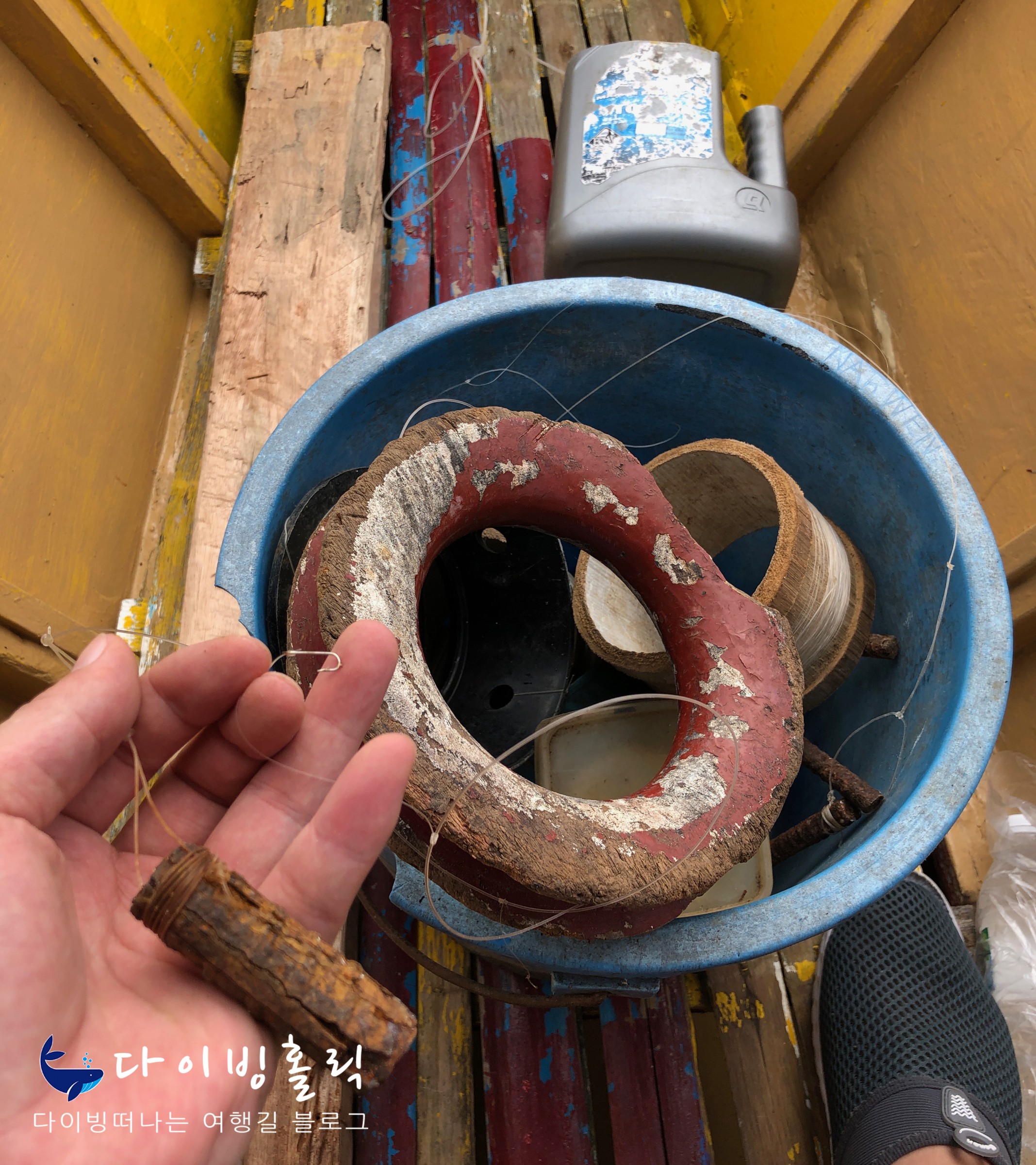 중간에 선장님이 낚시도구를 가져오려면 자기네 집에 들러야한다며 작은 어촌마을에 잠시 정박했습니다. 그리고 잠시뒤에 낚시장비라며 가져온 이것.