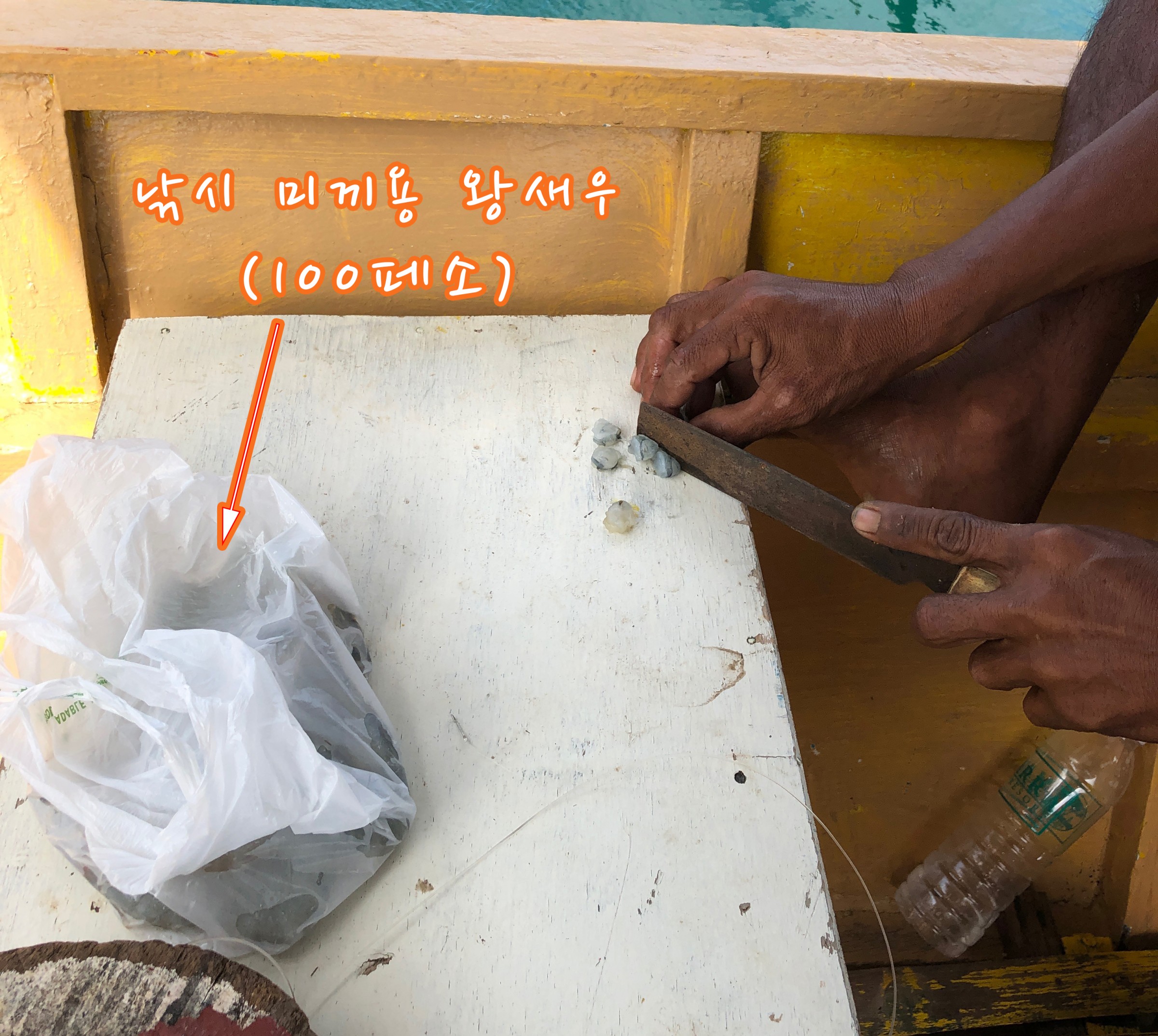 미끼를 따로 사야했는데 사방 한 쪽 수산시장으로 안내를 받아 재래시장에서 생새우 100페소 어치를 구입했습니다. 필리핀돈 100페소면 2018년 환율 기준으로 2200원이예요. 대하만한 크기의 죽은 왕새우를 10마리정도 주더군요. ‘음.. 이정도면 그냥 소금구이로 내가 먹으면 안돼나…’